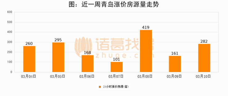 根据诸葛找房数据显示,青岛24小时涨价房源量为282套,较03月09日增加121套,环比上涨75.2%。与此同时,涨价房源占比小幅扩大,业主信心有所提升。