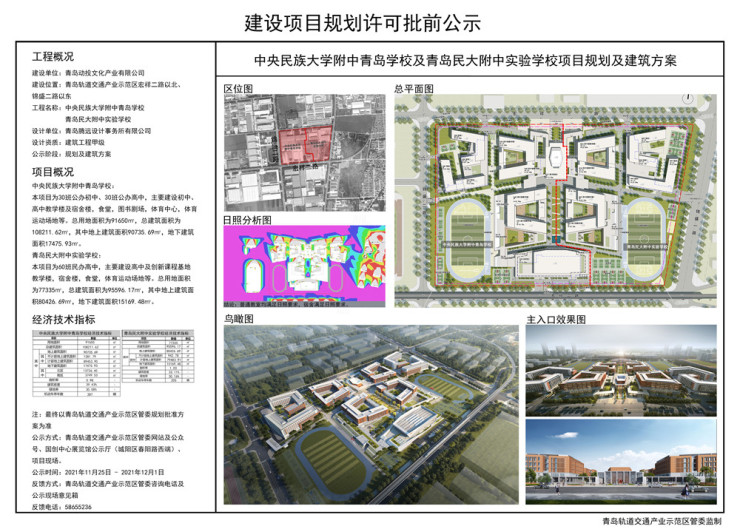 中央民族大学附中青岛学校及青岛民大附中实验学校规划建设,总用地面积约16.9万平方米。中央民族大学附中青岛学校规划为30班公办初中、30班公办高中;青岛民大附中实验学校规划60班民办高中。