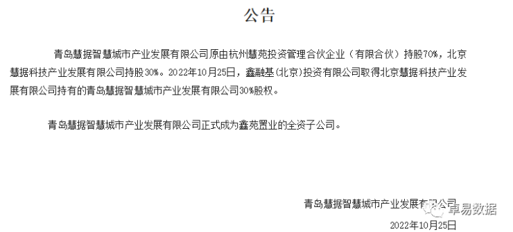 10月25日,鑫融基(北京)投资有限公司(鑫苑置业)司法拍卖获得青岛慧据智慧城市产业发展有限公司(鑫苑置业占股70%,北京慧据科技产业发展有限公司持股30%)30%的股权,成交价7.07亿,此次交易后鑫苑占股100%,青岛慧据智慧城市产业发展有限公司正式成为鑫苑置业的全资子公司。