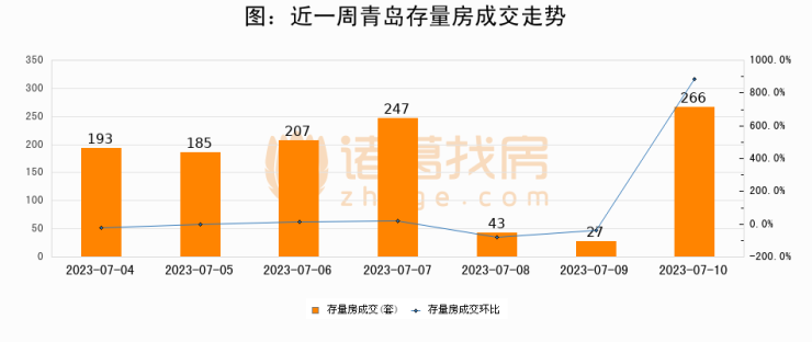 从存量房来看,2023年07月10日青岛存量房单日成交266套,比昨日增加239套,环比上涨885.2%。从近一周存量房成交来看,青岛存量房日均成交套数为166套,07月10日单日成交266套,高于近一周平均水平60.2%。