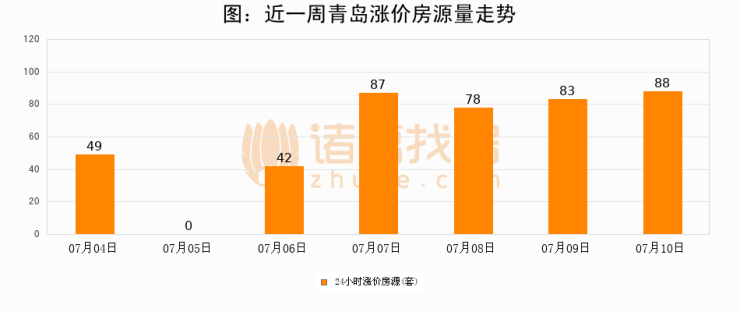 根据诸葛找房数据显示,青岛24小时涨价房源量为88套,较07月09日增加5套,环比上涨6%。与此同时,涨价房源占比小幅扩大,业主信心有所提升。
