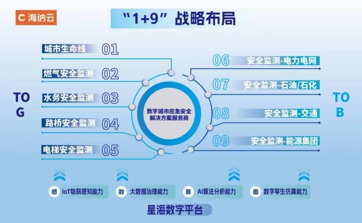 海纳云不断发挥在主体和空间层面向外延展,在城市生命线之外,拓展更多场景,形成“1+9”的战略布局,探索未来的更多可能。
