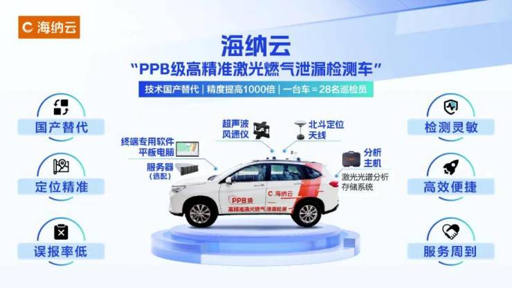 另一方面,聚焦场景需求,海纳云也匹配开发AI电梯摄像头、燃气检测车、管道漏损相关仪和燃气泄漏探测器等硬件。其中,“PPB 级高精准激光燃气泄漏检测车”成功打破垄断,实现了燃气微量泄漏检测技术的自主可控,这一技术的问世,也成功让海纳云中标“胜利股份PPB级高精准车载燃气泄漏检测设备采购项目”,挺起“青岛智造”的脊梁。