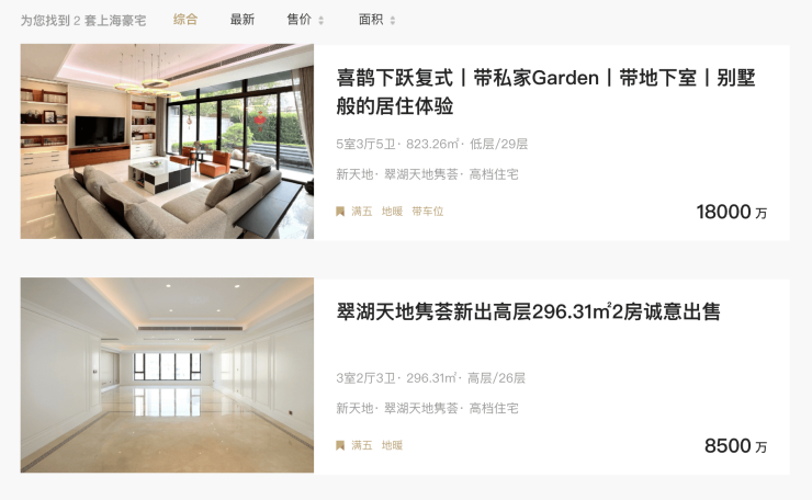 从当前市场挂牌情况看,高端公寓租售买卖平台丽兹行官网显示,翠湖天地隽荟的挂牌套数共显示2套,挂牌总价介于8500万元至1.8亿元,挂牌单价介于21.86万元/平方米至28.69万元/平方米。中海建国里挂牌3套房源,挂牌总价介于3260万元至4200万元,挂牌单价介于23.57万元/平方米至26.20万元/平方米。