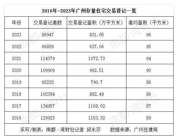拉长时间线看,南都湾财社报道,2023年广州二手住宅交易登记套数创下近八年的第二低位,但其套均面积却达到近八年最高位,套均面积约96平方米。