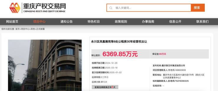 2024年12月26日,永川区凰城御府、凤凰雅苑等8处公租房30年经营权首次在重庆联合产权交易所挂牌转让,挂牌到期时间为2025年1月2日,转让底价为6369.85万元,建筑面积共计92808.58平方米,住宅套数1345套。