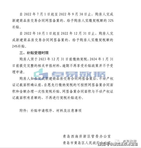 二、自 2022 年 7 月 1 日起至 2022 年 9 月 30 日止,购房人完成新建商品房交易合同网签备案的,给予购房人实缴契税额的 32%补贴。