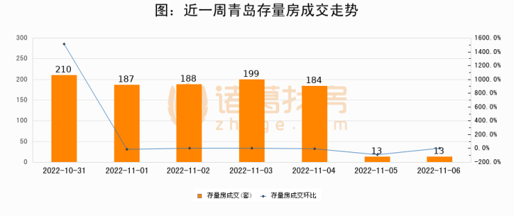 从存量房来看,2022年11月06日青岛存量房单日成交13套,比昨日持平。。从近一周存量房成交来看,青岛存量房日均成交套数为142套,其中10月31日成交量较高为210套,11月06日单日成交13套,低于近一周平均水平90.8%。