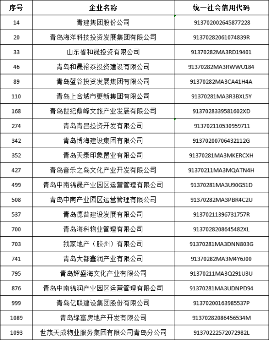 上榜企业中,依然不乏天泰、青建、中南、我家地产等知名企业。其中,青岛蓝谷投资发展有限公司、青岛海洋科技投资发展集团有限公司、青岛上合城市更新集团有限公司等再次榜上有名。