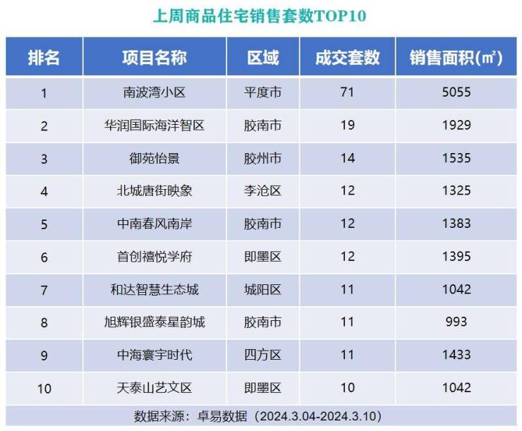 从各项目成交套数来看,位于平度市的南波湾小区以成交71套的成绩列榜单首位;位于西海岸新区的华润国际海洋智区以成交19套成绩上榜第二位;位于胶州市的御苑怡景以成交14套的成绩列榜单第三位。