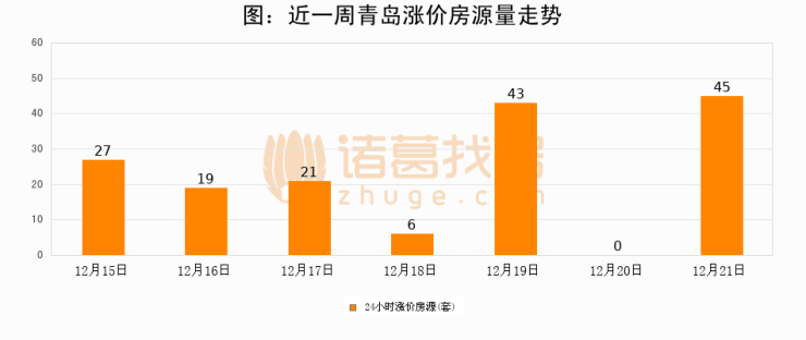 根据诸葛找房数据显示,青岛24小时涨价房源量为45套,较12月20日增加45套,环比上涨0%。与此同时,涨价房源占比小幅扩大,业主信心有所提升。