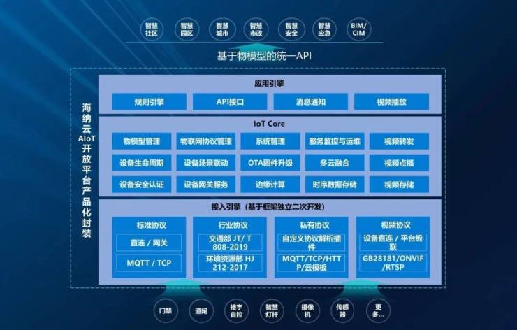“海纳云AIoT平台”具备广泛的设备连接能力,通过产品化封装,具体项目的落地实施可降低研发成本80%以上;预置70+主流品牌、100+设备种类,快速接入,效率提升60%以上;融合了主流的IoT云平台,打通城市/社区空间和家居空间,实现不同空间、不同品牌的设备连接和互动;同时,还具备流媒体泛物联能力及云边协同运行能力,为用户打造“数据+视频”双链路传输和灵活部署的体验。目前,该平台已在“胶州老旧社区改造““王台智慧镇街”“青岛市道路桥梁监管服务平台”等样板工程中应用,极大满足G端/B端/C端用户治理精细、服务高效、生活美好的需求。