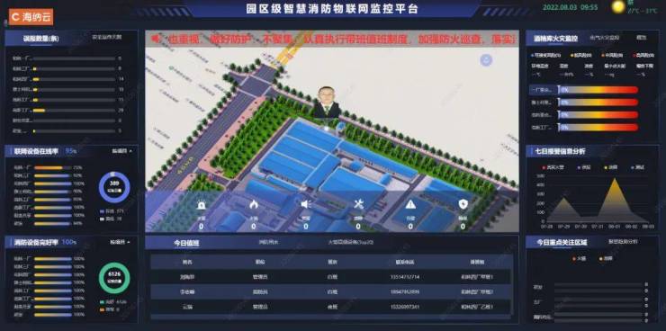 “园区级智慧消防物联网监控平台”将分布在园区的火灾报警系统、消防水系统等建筑消防系统组成“防火一张网”,采集多点分散的设备设施数据,上传至应用平台,实现园区消防系统全时、全局、全面的集中监控管理。目前已在内蒙古蒙牛厂区、河北邢台智慧消防等项目中得到落地应用。