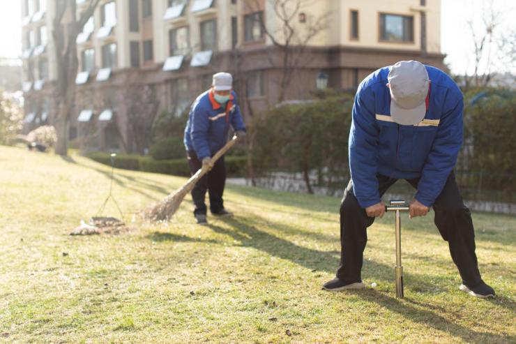 建植三年以上的草坪必须在早春草坪萌动前,采取打孔透气、划条梳草等措施疏松土壤。一般会使用割草机对冬季草坪留草高度过高的草坪进行低修剪,去除草坪顶部干枯部分,再依次去除草垫层/枯草层和草屑等杂物。
