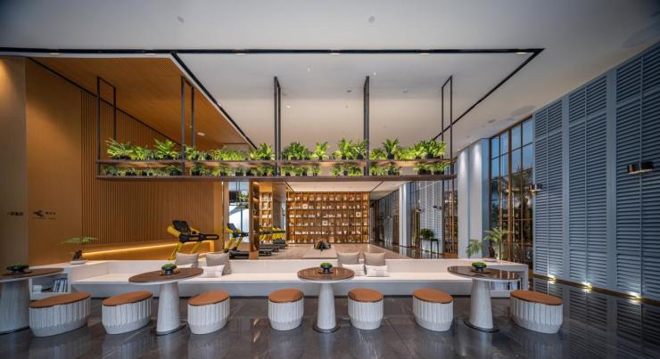 滨湖国际也把这种美放到了建筑上,玻璃幕墙配着铝板挑檐的装饰,“三横五纵”的立面设计,规整里带着优雅,颇有写意山水的意境。