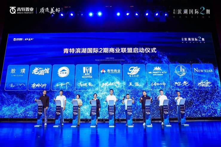 在盛典现场,肯德基、必胜客、致璞咖啡、老酒馆、世纪家家福超市、MK PARTY KTV、蓝调电竞、纽斯温泉8大品牌商家代表共同登台,与青特商业一起启动青特商家战略联盟,未来期待合作提前呈现繁华精彩的商业场景,演绎滨湖生活的万千精彩。