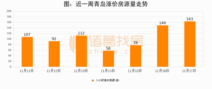 根据诸葛找房数据显示,青岛24小时涨价房源量为163套,较11月16日增加14套,环比上涨9.4%。与此同时,涨价房源占比小幅扩大,业主信心有所提升。
