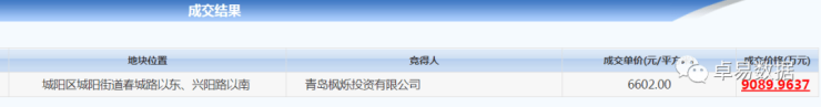 12月12日,城阳北岸绿茵城西侧地块成交,共有2家竞买人,只有一家竞买人出价最后被青岛枫烁投资有限公司竞得,楼板价6602元/㎡,成交总价9090万。该房企曾经开发了城阳标杆项目碧玺园。