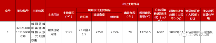 地块位于城阳区城阳街道春城路以东、兴阳路以南,占地面约9179㎡,容积率1.5,建筑面积13768.5㎡,建筑密度25%,绿地率35%,楼面起始地价6602元/㎡,起拍总价9090万元,竞买保证金4545万元。