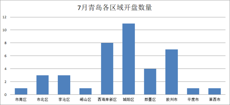根据搜狐焦点网站统计,7月份青岛全市共40盘入市或加推,其中,城阳区推盘量最多,共11盘,西海岸新区8盘,胶州市7盘,即墨区4盘,市北区、李沧区各2盘,市南区、崂山区、莱西市、平度市各1盘。