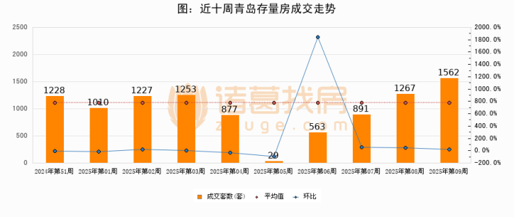 存量房方面,第09周青岛存量房成交1562套,较上周增加295套,环比上涨23.3%。从近十周成交走势来看,周均成交套数为990套,本周高于平均水平57.8%。