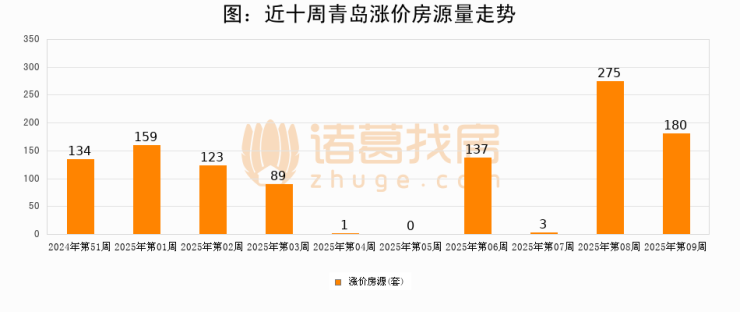 从调价房源来看,第9周青岛涨价房源180套,较上周下降34.5%。与此同时,9周涨价房源占比提升1.46个百分点,业主信心持续恢复。