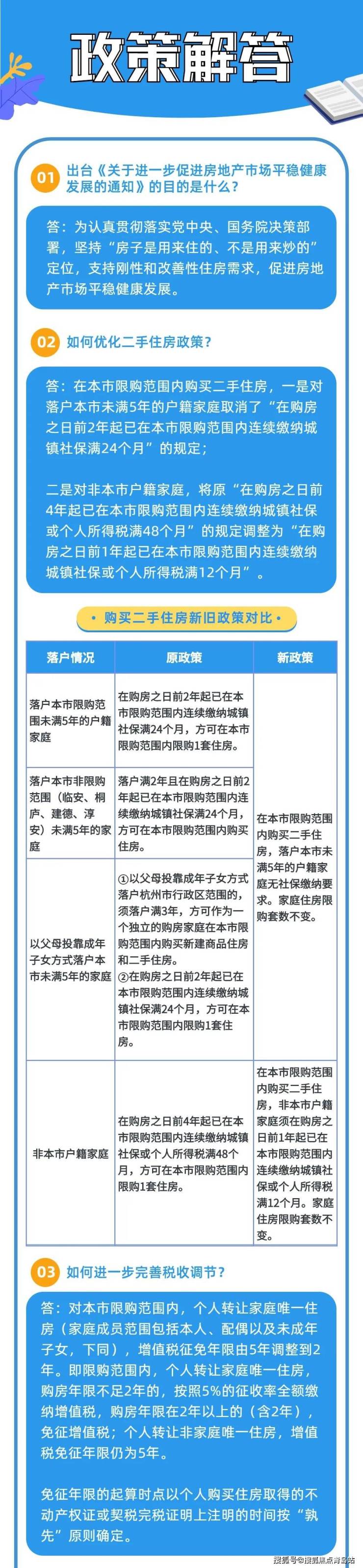此外,《通知》明确进一步完善税收调节政策。对杭州市限购范围内,个人转让家庭少有住房的,增值税征免年限由5年调整到2年。个人转让非家庭少有住房的,增值税征免年限仍为5年。
