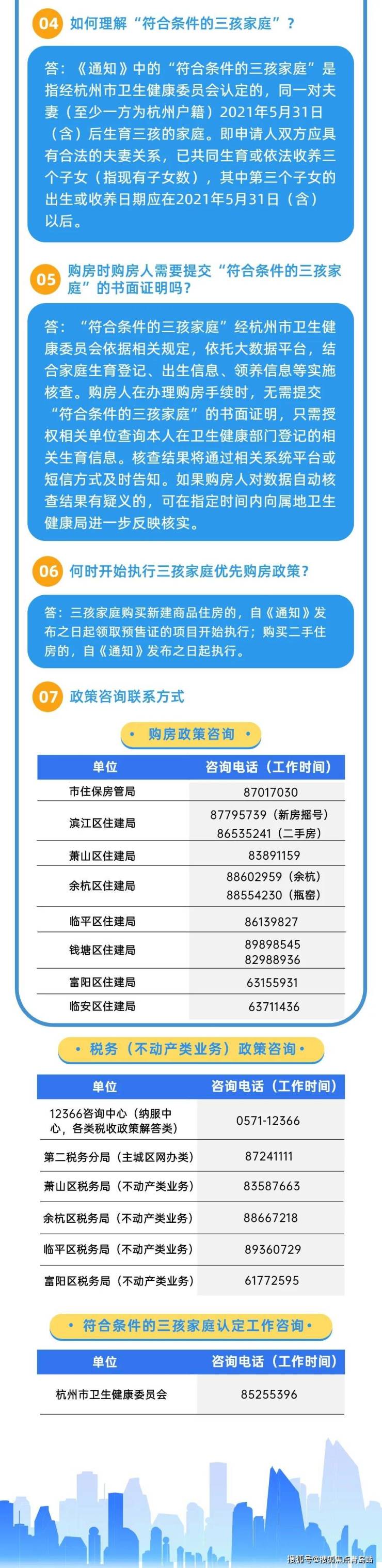 同时,《通知》明确更好满足三孩家庭购房需求。一是符合条件的三孩家庭,在杭州市限购范围内限购的住房套数增加1套;二是符合条件的三孩家庭在报名参加新建商品住房公开摇号销售时,参照“无房家庭”优先摇号。