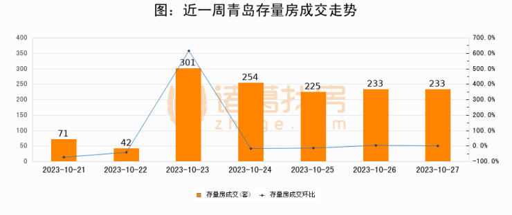 从存量房来看,2023年10月27日青岛存量房单日成交233套,比昨日持平。。从近一周存量房成交来看,青岛存量房日均成交套数为194套,10月27日单日成交233套,高于近一周平均水平20.1%。