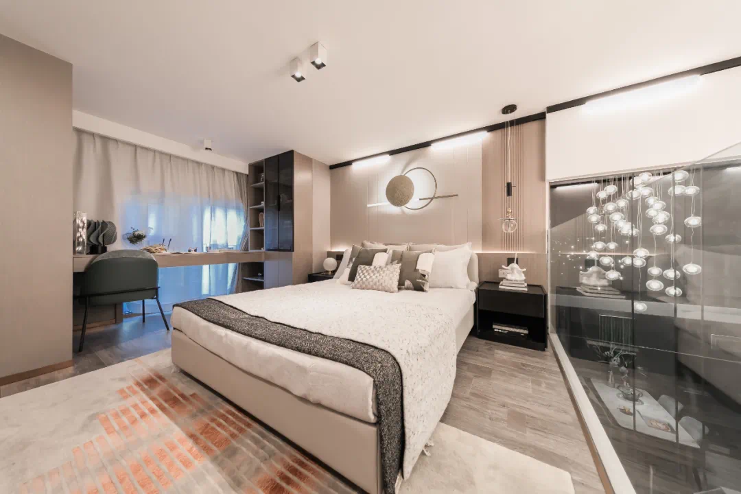 对于讲求自由的生活家来说,海景跃层,更是承载了关于美好的想象。一层会客空间、备餐区、卫浴等功能规划,社交与休息空间合理区隔,亲友欢聚不拘束,独处时光不被打扰,任何场景都能轻松驾驭,当孩子降生的时候,利用灵活的可扩展空间,为宝贝打造独立的成长空间。