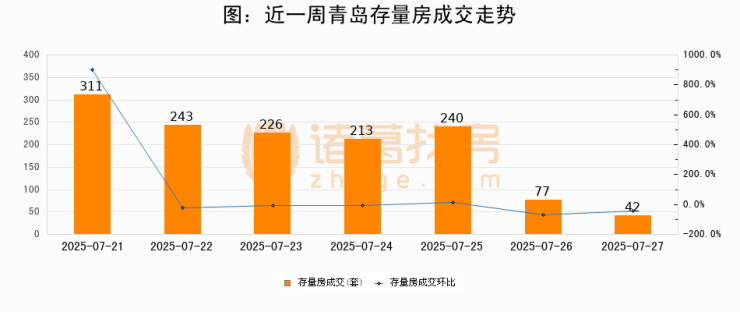 从存量房来看,2025年07月27日青岛存量房单日成交42套,比昨日减少35套,环比下降45.5%。从近一周存量房成交来看,青岛存量房日均成交套数为193套,07月27日单日成交42套,低于近一周平均水平78.2%。