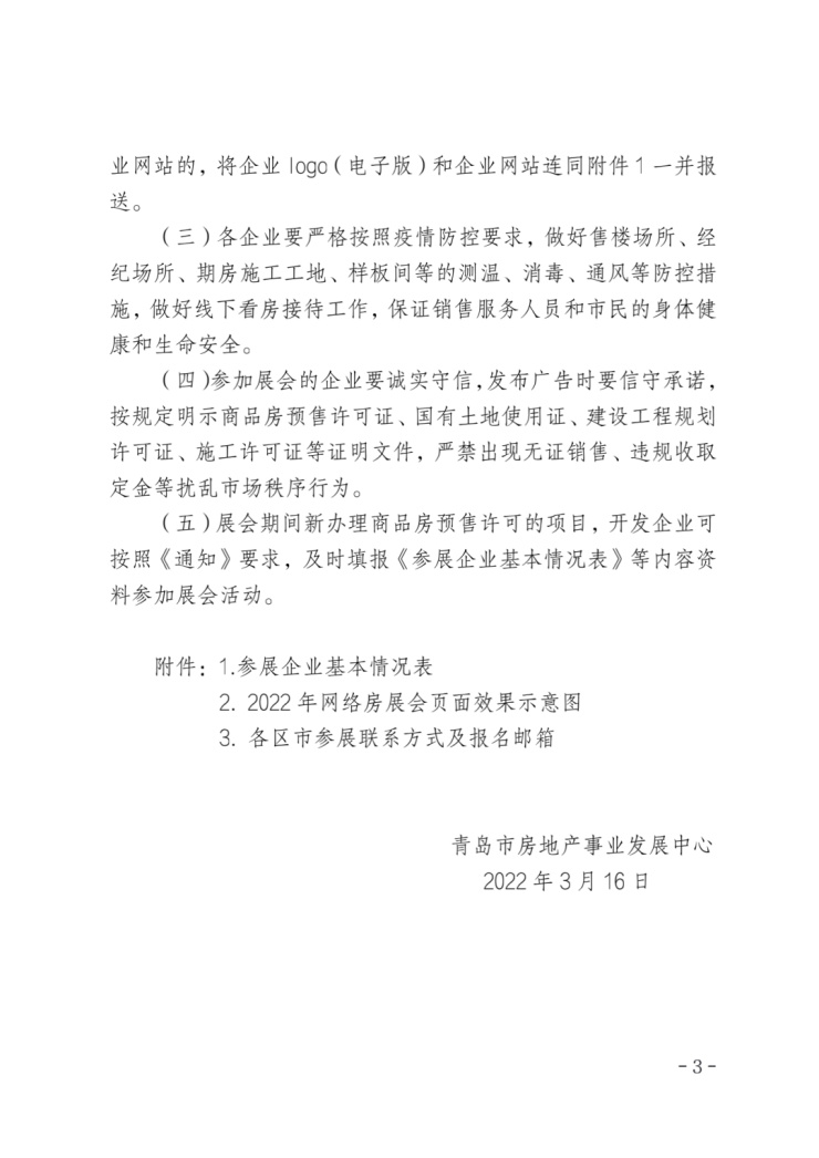 (二)各区(市)住建部门负责通知本辖区在售商品房项目开发企业积极参展,按《通知》要求填写《参展企业基本情况表》(附件1),并负责统一汇总后于2022年3月17日17:00前通过金宏报送至青岛市房地产事业发展中心市场监测处。参展企业需要在展会企业展厅(附件2)界面设置企业logo和需要链接企业网站的,将企业logo(电子版)和企业网站连同附件1一并报送。