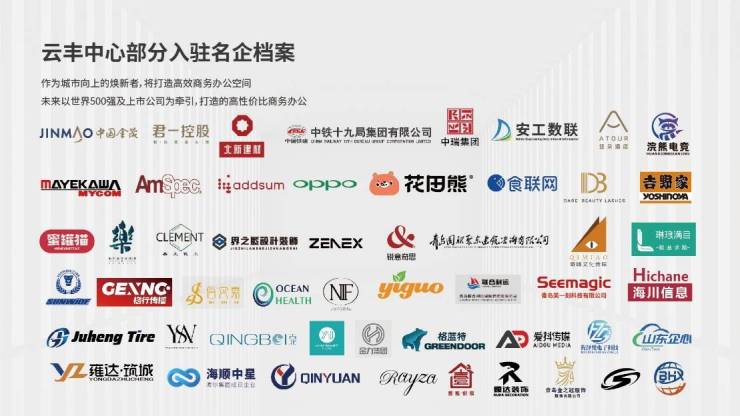 作为崂山、市北、李沧三区交汇地带的重点产城融合项目,云丰中心自启动招商以来便备受关注。此次C栋满租,成功引入超百家优质企业,其中包括中国金茂、君一控股、安工数联、中铁十九局、北新建材等5家世界500强企业,ADDSUM、AMSPEC、MAYEKAWA等3家知名外资机构,以及花田熊、OPPO等行业领军企业,形成了高密度、高质量的企业生态圈。
