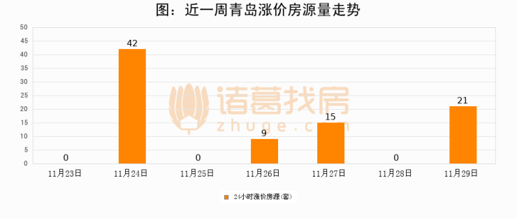 根据诸葛找房数据显示,青岛24小时涨价房源量为21套,较11月28日增加21套,环比上涨0%。与此同时,涨价房源占比小幅扩大,业主信心有所提升。