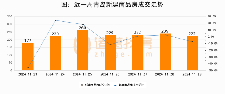 根据青岛市住房和城乡建设局数据显示,2024年11月29日青岛新建商品房成交222套,较昨日减少17套,环比下降7.1%