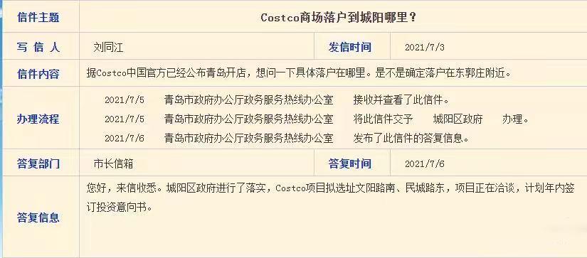 在最近的政府回复中,经城阳区政府落实,Costco项目拟选址文阳路南、民城路东,项目正在洽谈,计划年内签订投资意向书。