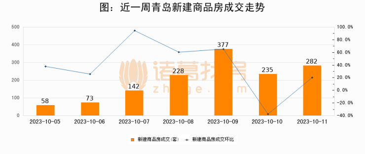 根据青岛市住房和城乡建设局数据显示,2023年10月11日青岛新建商品房成交282套,较昨日增加47套,环比上涨20%