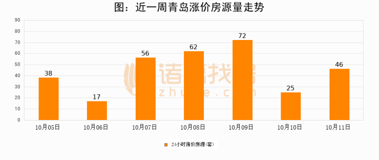 根据诸葛找房数据显示,青岛24小时涨价房源量为46套,较10月10日增加21套,环比上涨84%。与此同时,涨价房源占比小幅扩大,业主信心有所提升。