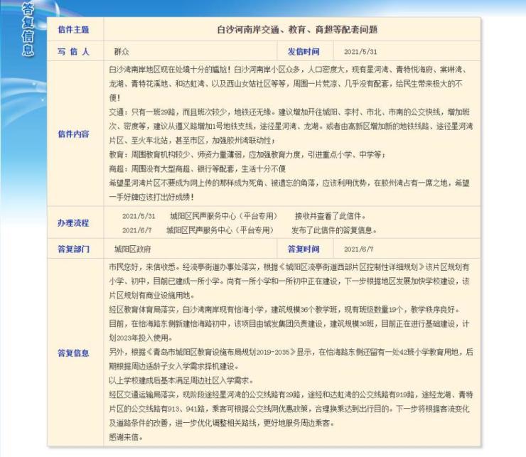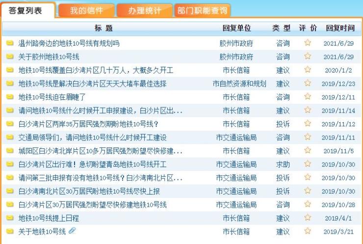 而在较新的信箱咨询中,官方表示:根据已批青岛市城市轨道交通线网规划,目前地铁10号线仍处于前期规划研究阶段,地铁集团正在积极推进,结合新一轮轨道交通线网规划的编制,进一步优化线路走向和站位方案,同时为更好的服务白沙湾片区,经初步研究拟在白沙湾区域增设新线路,在该区域构建完善的轨道交通服务网络。