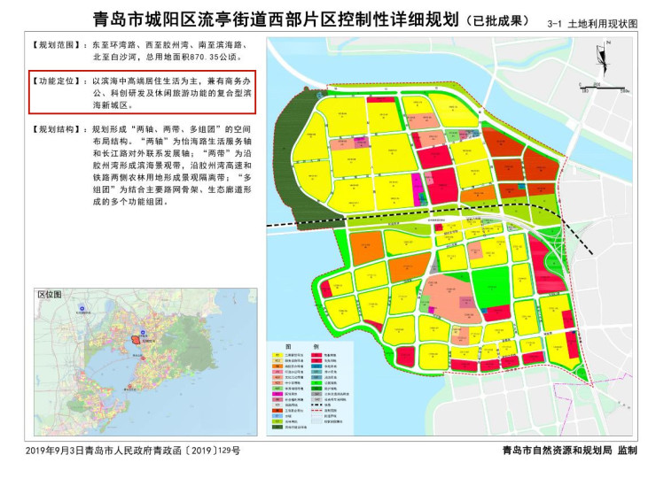 根据2019年青岛市自然资源和规划局发布的《城阳区流亭街道西部片区控制性详细规划》来看,位于流亭街道西部片区的白沙河板块,未来将定位打造多功能于一体的复合型滨海生活新城,其原话是“以滨海中高端居住生活为主,建有商务办公、科创研发及休闲旅游功能的复合型滨海新城区”。