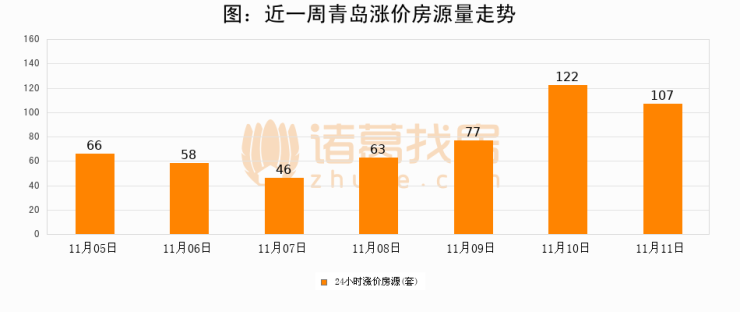 根据诸葛找房数据显示,青岛24小时涨价房源量为107套,较11月10日减少15套,环比下降12.3%。与此同时,涨价房源占比小幅回落,对于购房者来说是一个入市窗口期,购房者可抓住时机入市。
