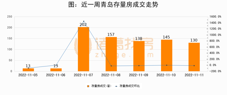 从存量房来看,2022年11月11日青岛存量房单日成交130套,比昨日减少15套,环比下降10.3%。从近一周存量房成交来看,青岛存量房日均成交套数为114套,其中11月07日成交量最高为202套,11月11日单日成交130套,高于近一周平均水平14%。