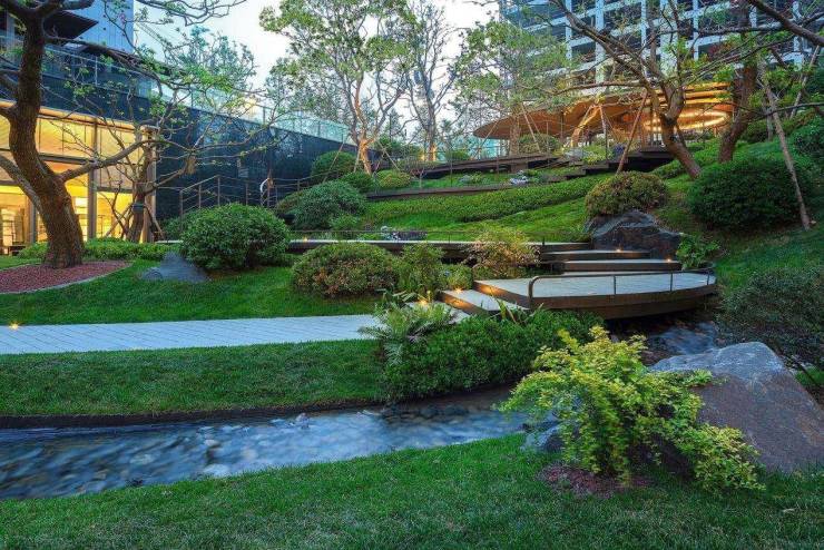青岛和樾府项目打造青岛首个自然坡地式的下沉庭院景观体系,以大堂为基点形成立体系统,下沉庭院融入悬桥栈道和潺潺水系、约1180㎡主题乌柏林,实现与公共活动空间无界串联。