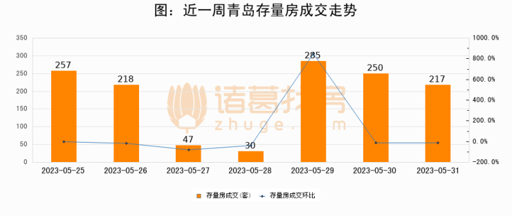 从存量房来看,2023年05月31日青岛存量房单日成交217套,比昨日减少33套,环比下降13.2%。从近一周存量房成交来看,青岛存量房日均成交套数为186套,05月31日单日成交217套,高于近一周平均水平16.7%。