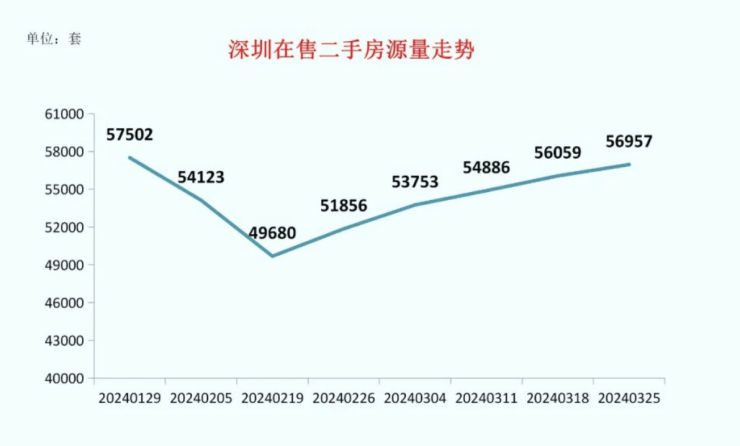 而从挂牌量来看,根据公开在售二手房源量数据统计,截至2024年3月25日,深圳全市共有56957套有效二手房源在售,较前一周增加898套。