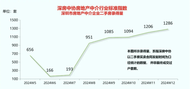 3月25日,深圳市房地产中介协会发布数据,2024年第12周(3月18日至3月24日),深圳全市二手房成交量(含自助)录得1286套,环比增长6.6%。