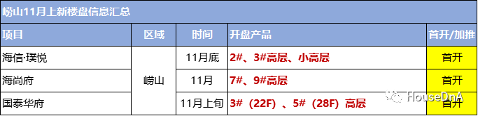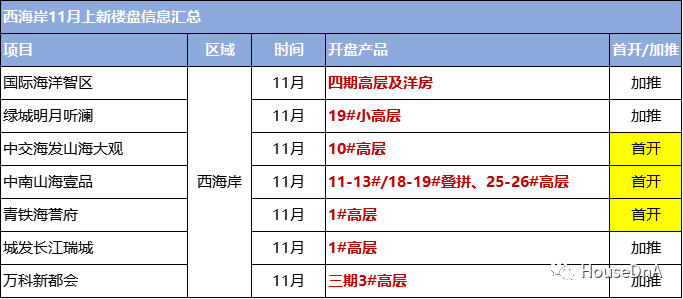 11月,西海岸推盘量也并不多,7盘包含3个新盘和4个加推盘,新盘中不乏老面孔,首开时间一拖再拖。中交海发山海大观和青铁海誉府都计划推出1栋高层产品,而中南山海壹品首开两栋高层外,还将同时推出五栋叠拼住宅。