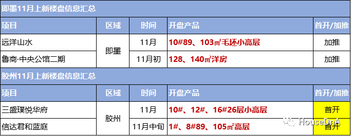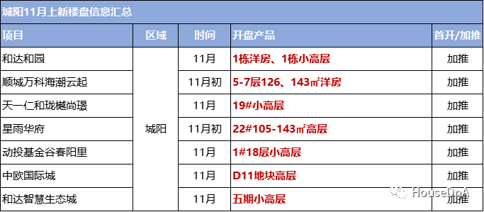 城阳11月仍“谨慎”态度入市,仅有7盘上新,全部为加推楼盘。改善板块中,夏庄的天一仁和珑樾尚璟将推出91㎡装修小高层,目前在售的小高层均价在16000-17000元左右;生活配套一应俱全的白云山片区的和达和园,11月预计将推出1栋洋房和1栋小高层(楼座未定),在售洋房和小高均价在15000元。