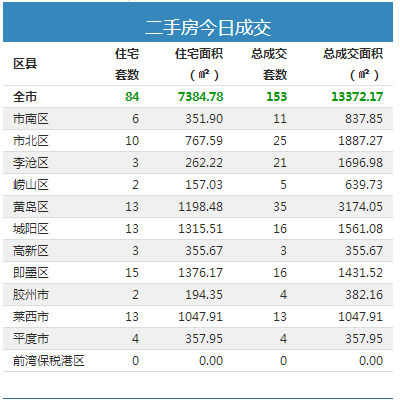 11日全市二手房成交153套,总成交面积13372.17㎡,包括住宅84套,成交面积7384.78㎡。(图为各区市住宅交易量数据)
