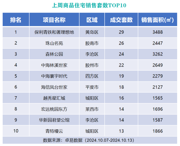 从各项目成交套数来看,位于西海岸新区的保利青铁和著理想地以成交29套的成绩列榜单首位;珠山名苑以成交26成绩上榜第二位;位于李沧区的森林公园以成交24套的成绩列榜单第三位。